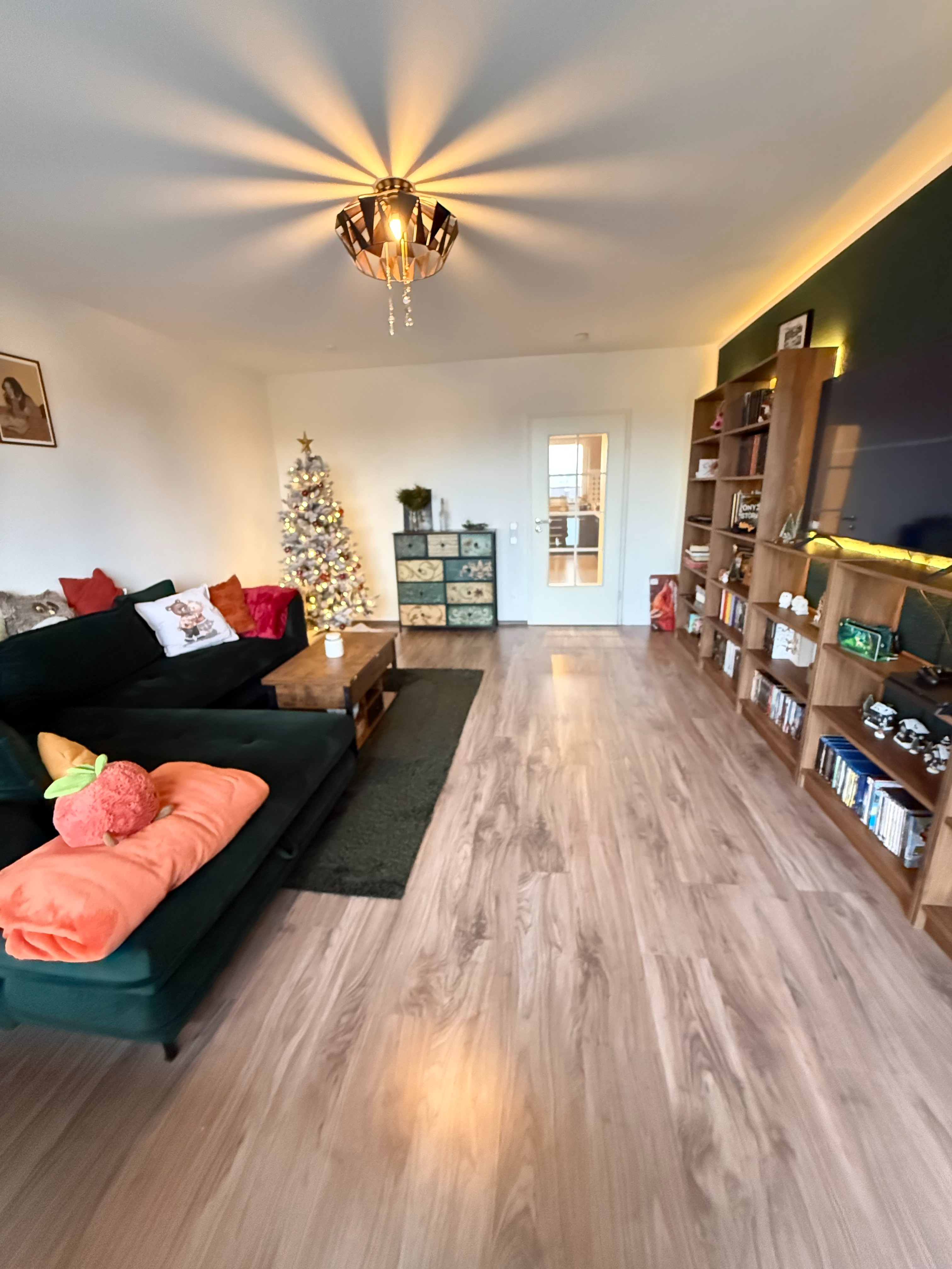 Die Wohnung bietet helle, freundliche Räume, die durch große Fensterflächen mit viel Tageslicht versorgt werden. Moderne Bodenbeläge in Holzoptik schaffen eine warme Wohnatmosphäre, während pflegeleichte Fliesenböden in den funktionalen Bereichen für Komfort im Alltag sorgen.